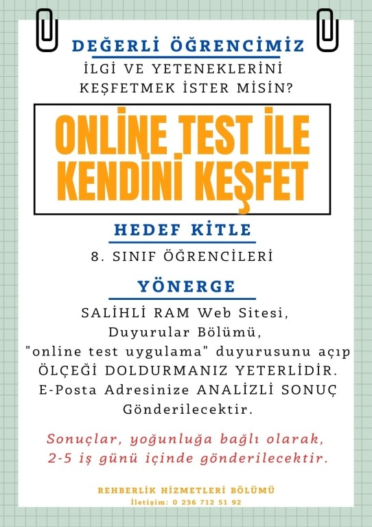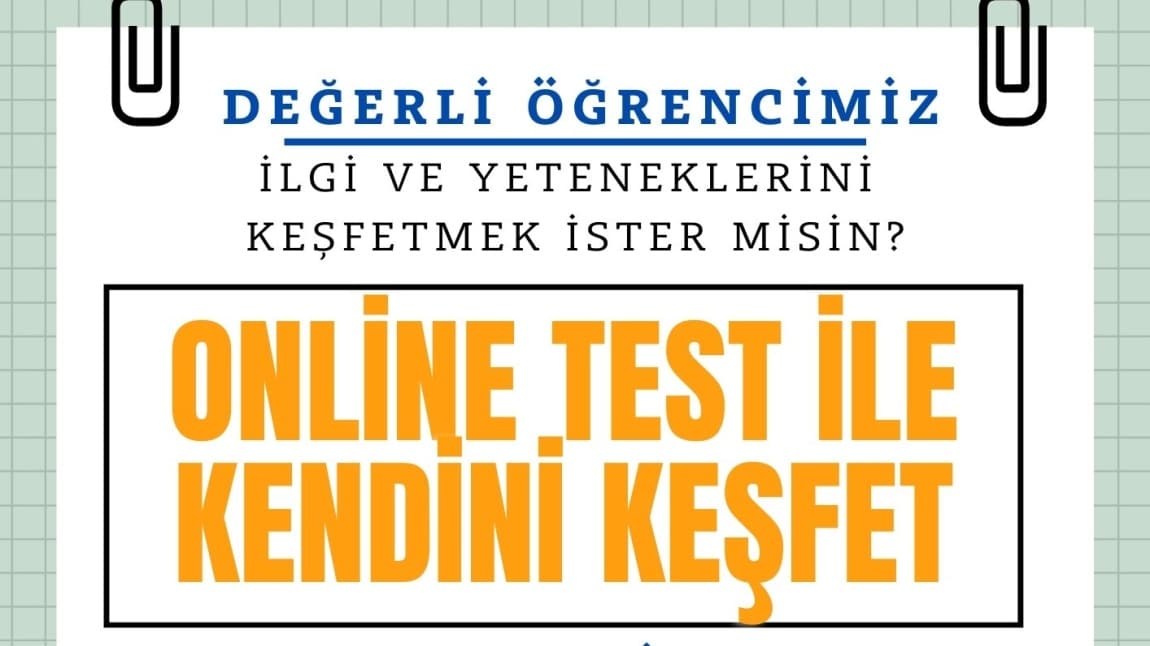 Online Test ile ilgi, yetenek ve değerlerinizi keşfedebilirsiniz. Bağlantıya tıklayarak forma giriş yapınız ve tüm sorulara doğru ve samimi cevaplarınızı veriniz. Sonuçlar yazmış olduğunuz mail adresinize iletilecektir.